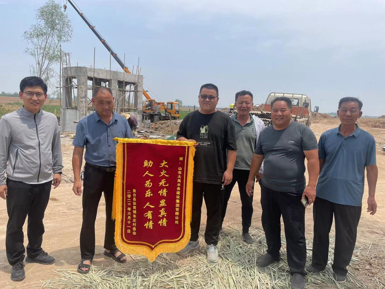 由于項目人員發現及時、處置得當,火勢及時得到有效控制,沒有大面積蔓延,**大程度減少了村民的財產損失。項目人員的擔當、作為,全力保障人民群眾生命財產的安全。朱莊村村委和群眾對項目人員的見義勇為行為表示高度認可,向山東大禹水務建設集團有限公司魚臺縣域水環境治理一期項目(濟寧市新萬福河治理工程(魚臺段))施工項目部贈送錦旗,表達謝意!