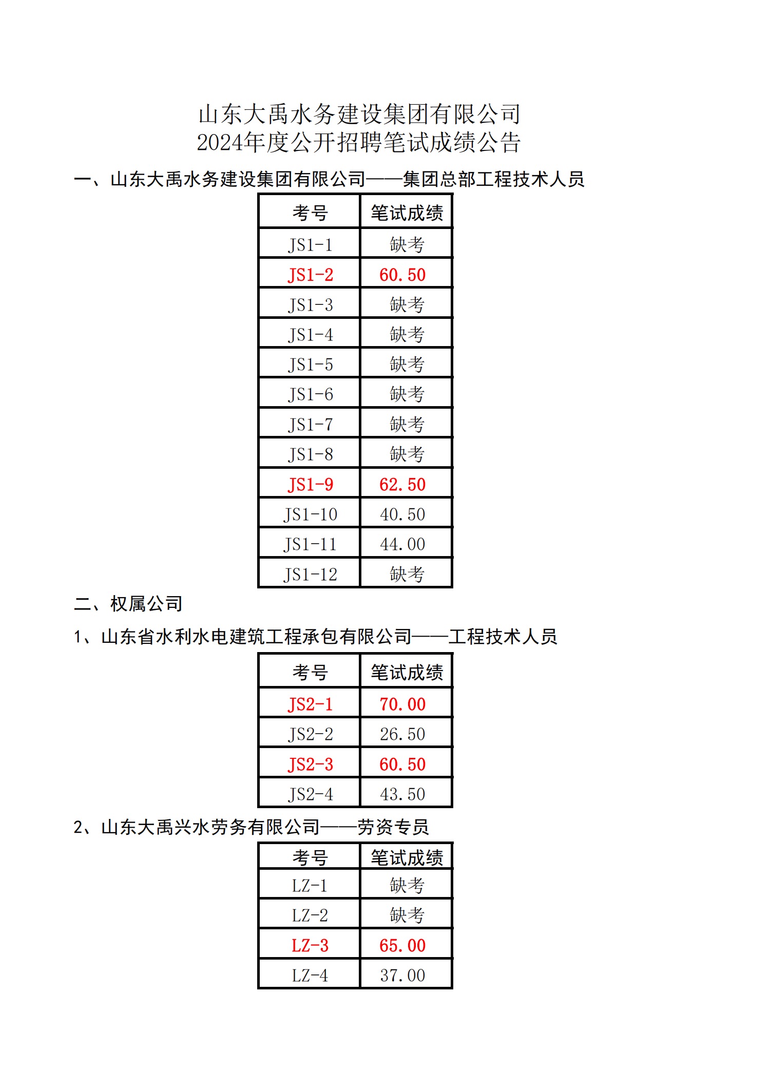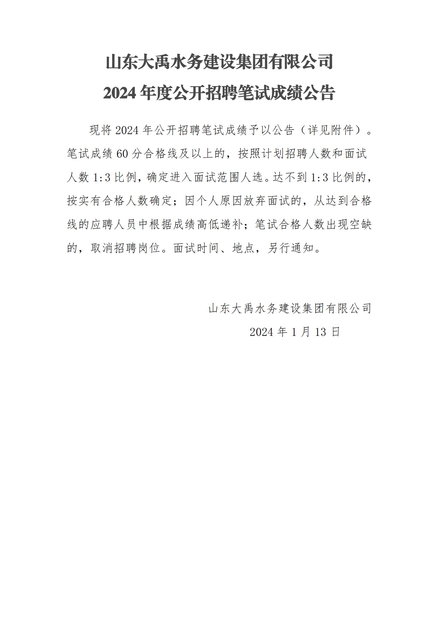 山東大禹水務(wù)建設(shè)集團(tuán)有限公司2024年度公開(kāi)招聘筆試成績(jī)公告
