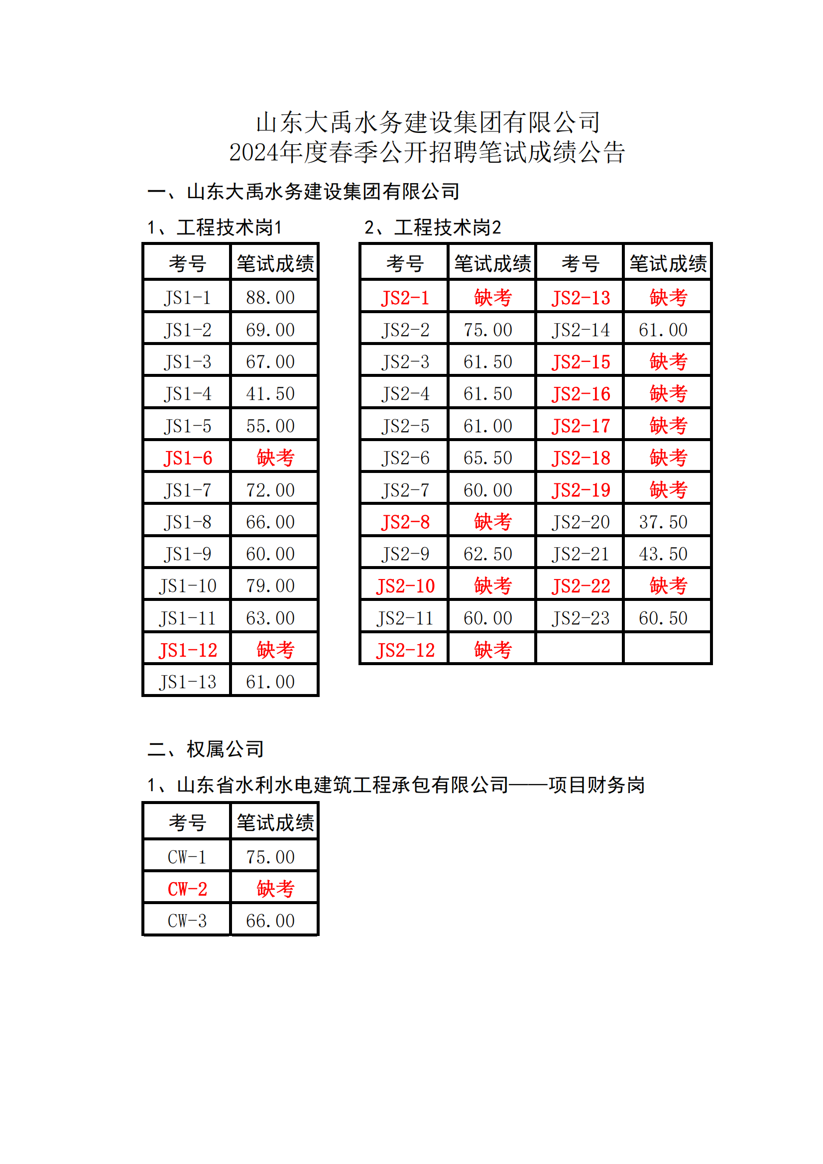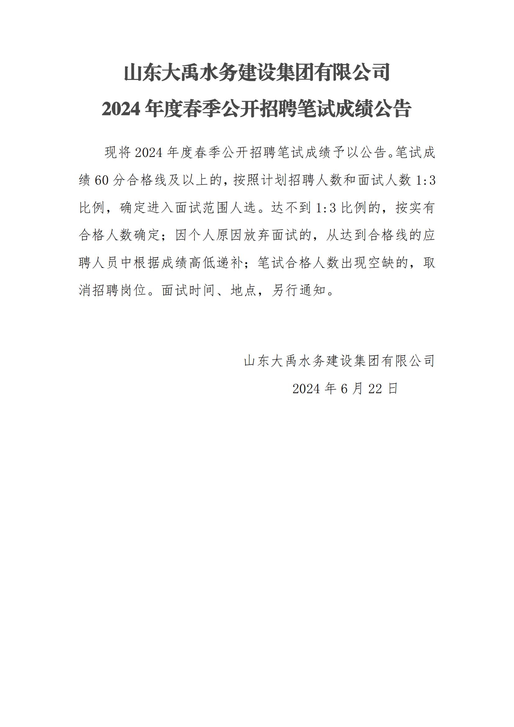 山東大禹水務建設集團有限公司2024年度春季公開招聘筆試成績公告