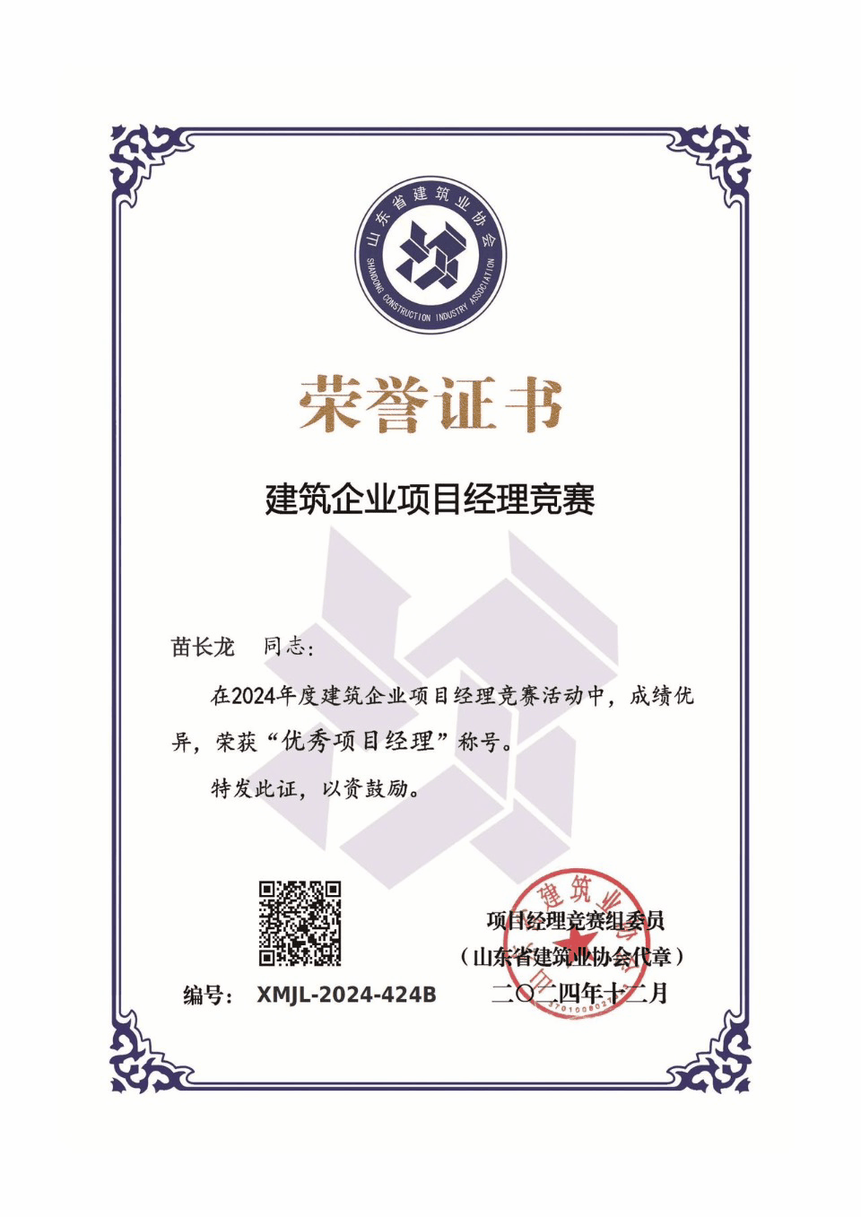 近日,山東省建設工會與山東省建筑業協會聯合發布《關于公布2024年度建筑企業項目經理競賽結果的通知》,山東大禹水務建設集團有限公司苗長龍、畢小軒、程紀虎、陳衛東四名同志憑借卓越的專業素養與出色的項目管理能力,一路過關斬將,歷經內部嚴格評審、層層推薦、決賽角逐、綜合評議及公示等系列規范流程,脫穎而出,被授予“2024年度山東省建筑業企業優秀項目經理”稱號。