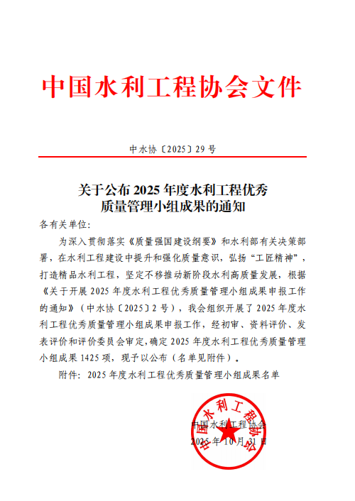 近日,中國水利工程協會公布了“2025年度水利工程優質質量管理小組”評審結果,集團公司申報的“提高波浪樁施工驗收一次合格率”等六項成果經過了初審、資料評價、發表評價和評審委員會審定,最終全部上榜。其中,3項成果榮獲I類成果,1項成果榮獲Ⅱ類成果,2項成果榮獲III類成果。