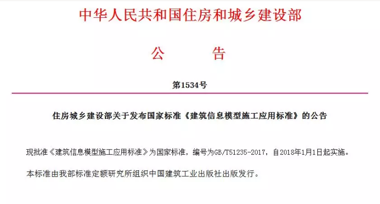 住建部印發國家標準《建筑信息模型施工應用標準》編號為GB/T51235-2017,自2018年1月1日起實施。