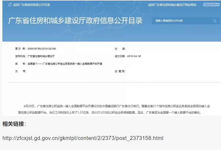4月30日,廣東省住建廳官網(wǎng)發(fā)布了該省住房公積金業(yè)務(wù)系統(tǒng)統(tǒng)一接入全國(guó)數(shù)據(jù)平臺(tái)開(kāi)通的新聞。廣東省成為全國(guó)第一個(gè)接入數(shù)據(jù)平臺(tái)的省份。